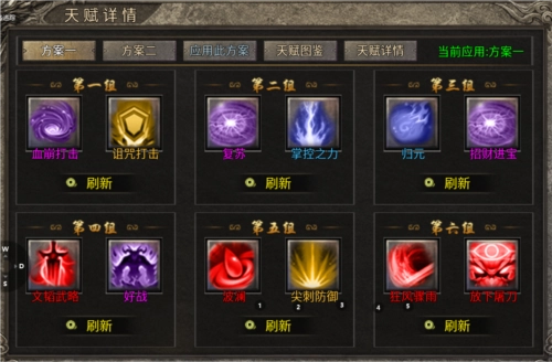 第一种在角色面板点开“天赋”直接能看到,每一组有两个天赋,天赋的品质由低到高分别为蓝、紫、橙、红,获取的天赋品质是随机的,并不是品质越高就一定越好,可根据自身需求调整;