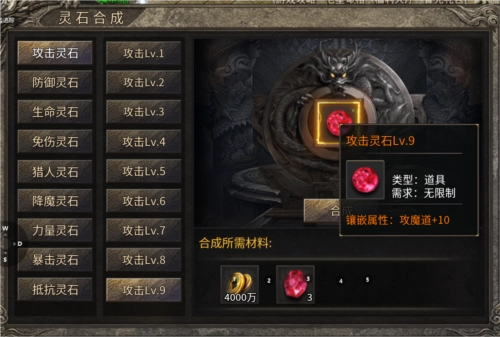 如果想进步一步追求战力的玩家,可以考虑极限提升一波灵石,灵石的种类数量需求是固定的,九种灵石每种5颗,按需分配资源,灵石需要先开孔才能镶嵌,更换装备后格子跟灵石会自动集成到新装备上,不用操心。