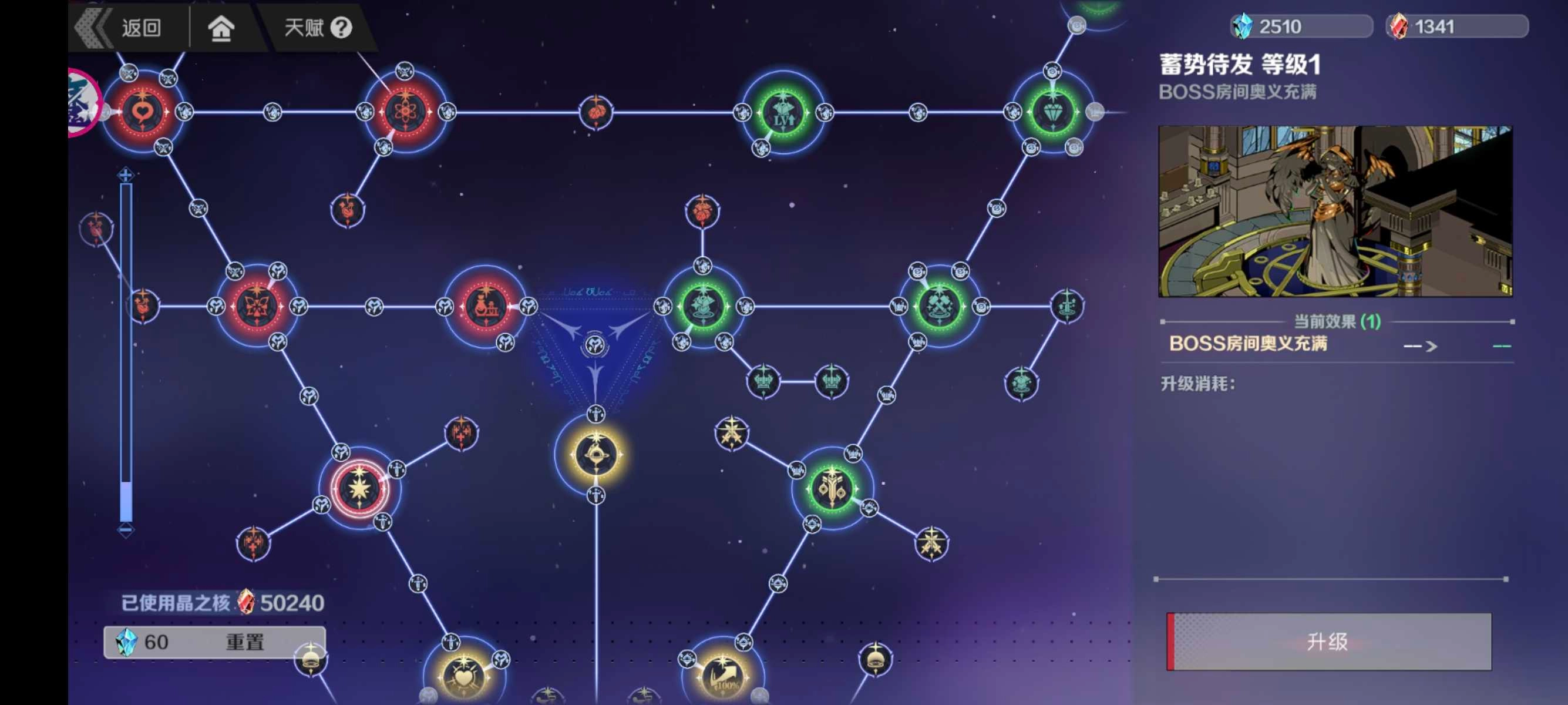 首先让我们来了解天赋系统的基本玩法,该系统共分为三个类别:绿色的局外功能区(位于右上)、红色的局内功能区(位于左上)以及黄色的战斗天赋(位于下方)。
