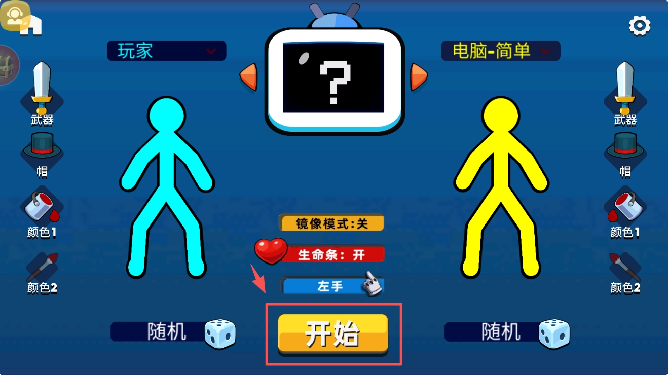 设置角色:进入角色设置界面后,挑选你想要的武器、帽子并选定颜色,随后点击“开始”按钮即可。