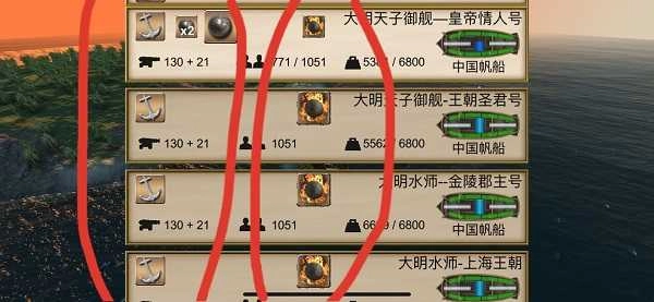 炸药桶不用带太多,这东西特别占地方。毕竟从投放炸药桶到它落水会有延迟,而且AI还会自动躲炸药桶。打最后两个港口时,最右边放一艘一级舰,先让其他船走,你开着右边这艘一级舰最后出发,这样能吸引大部分敌方舰队。炮弹装一千枚左右就行,剩下的空间全装炸药桶。要注意和追你的船保持1.5到2个舰尾炮的距离,离太近它会自动躲开。先扔一个试试,没炸中的话就不断变换位置,等炸中了就保持距离疯狂扔。用这方法能炸沉四五艘船。