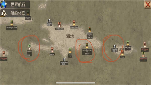 图中,被圆圈标注的船形图案代表舰队界面,箭头图案则用于切换不同船只。