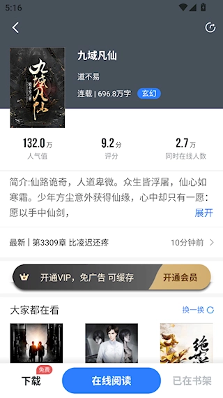 2. 进入详情页面后,能够进行分享、下载小说的操作,点击“在线阅读”即可开始阅读。