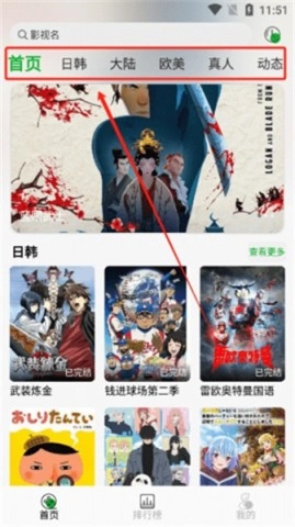 2、在首页中,用户可以在顶部分类列表选择动漫类型,或者通过【搜索框】输入想观看的动漫名称或关键词。