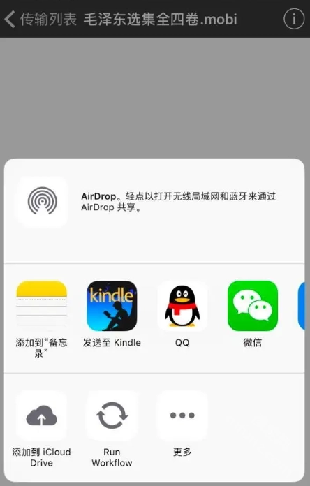 在手机上搜索想阅读的书籍,例如“毛选 mobi”,接着把书存到百度网盘里,之后在百度网盘中点击【打开】按钮(要注意别点「分享」选项)。