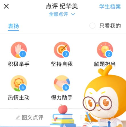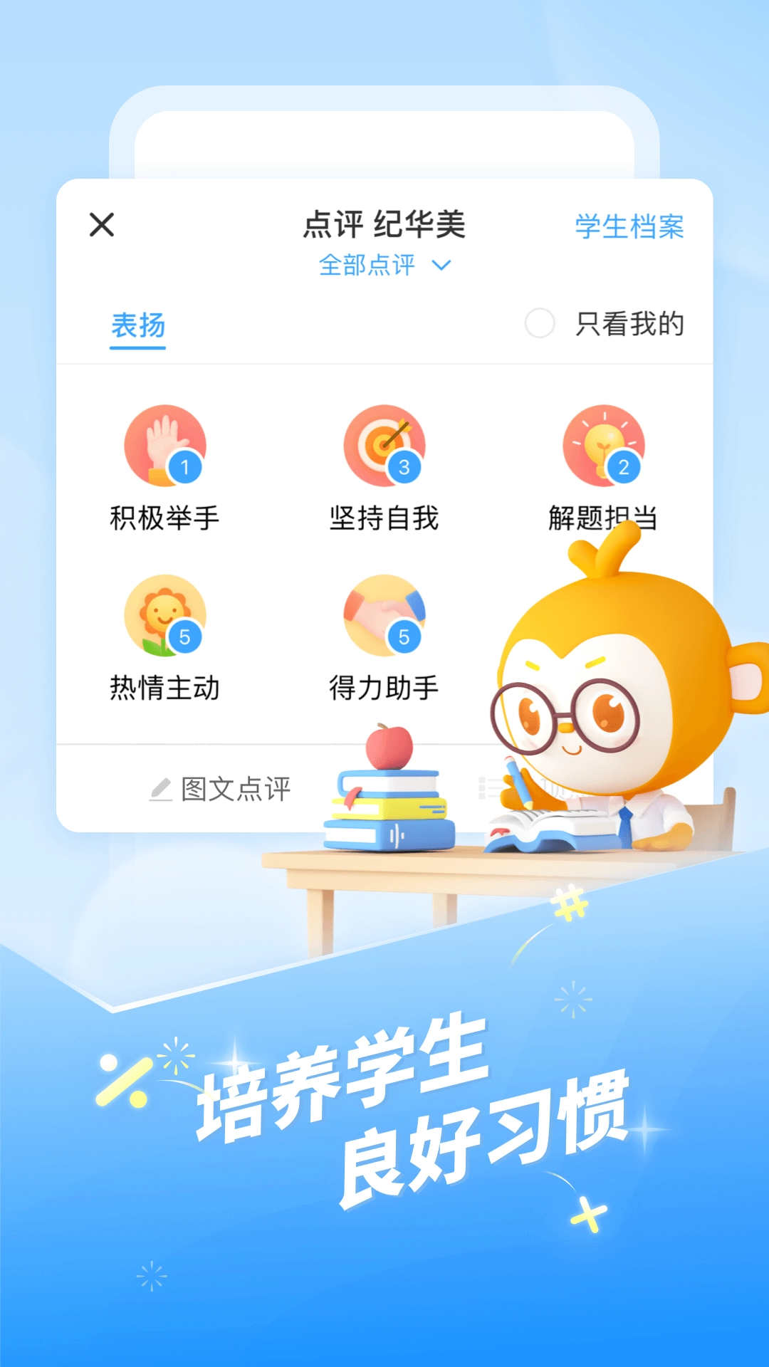 个性化点评系统支持教师自主创建班级,并邀请学生与家长加入其中。系统为每位学生配备专属卡通头像,教师无论是在课堂教学时段还是课余时间,都能借助评语模板,随时对学生开展多维度的评价与记录工作。