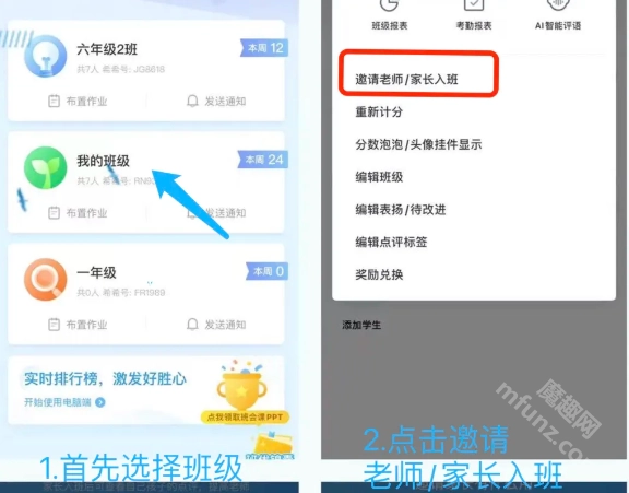 选择好班级后,点击页面右上角的三点图标,接着选择第一个选项“邀请老师/家长入班”。