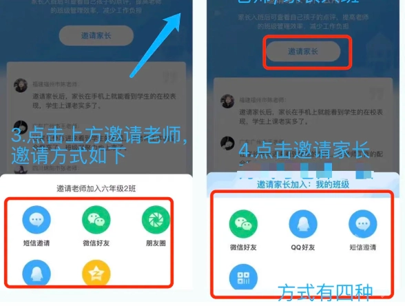 在页面中间点击“邀请家长”选项,就能通过微信、QQ、短信发送邀请,或者生成二维码分享到班级群来邀请家长。