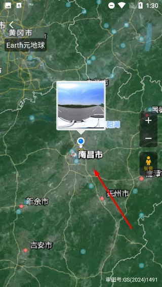 3、进入Earth元地球界面后,点击右侧【+】【-】按钮,可放大或缩小地图视图,调整地理内容的显示比例。