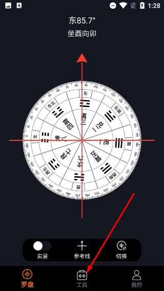 1、在罗盘界面查看方位信息后,点击底部【工具】按钮,可进入工具功能页面,使用各类辅助工具。