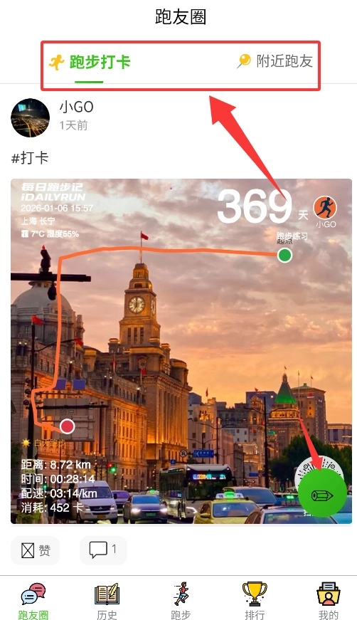 2、跑友圈页面支持查看跑步打卡动态,并能浏览附近跑友信息。