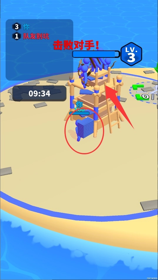 1、游戏开始后通过滑动屏幕控制角色移动,在场景中灵活走位收集散落的木材资源,为建造防御工事做准备。
