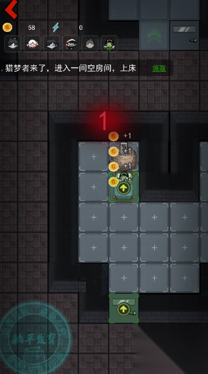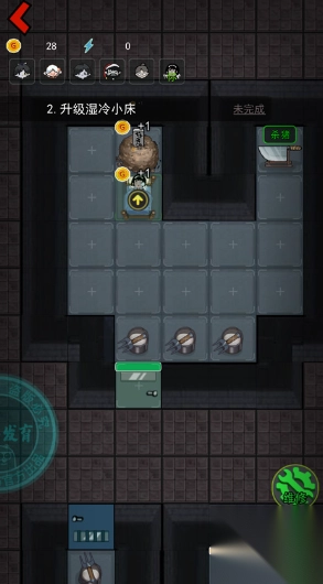 4、寻到房间后点击上床,随后优先对自己的门进行升级并建造炮台。前期炮台伤害虽不高,但猛鬼的伤害与血量同样有限。