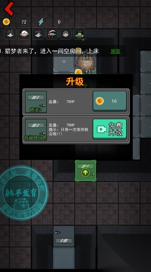 1、进入游戏,选择空闲的房间进行入睡,等待游戏开启。按照游戏任务进行升级床铺、炮塔等。