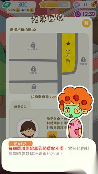 4、每个区域能招募到的房客不同,当然他们对房间的装修档次要求也不同。