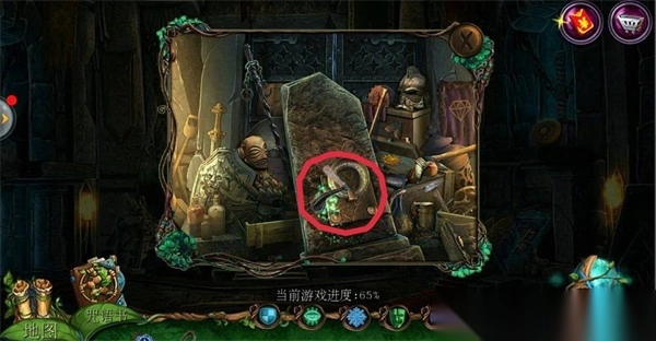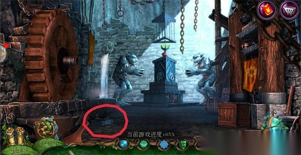 2、点击左边场景【哥布林房间】,点击中间下面的齿轮;在齿轮旁边拿到【铁链】;用【八边形钥匙】打开机关,在地上拿到【镰刀】。