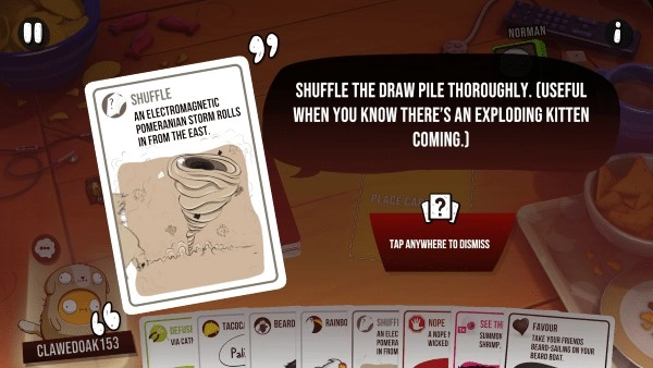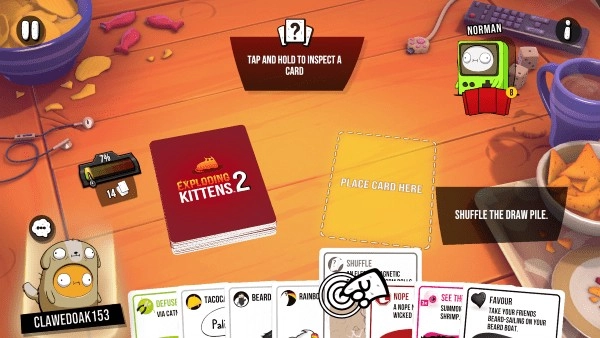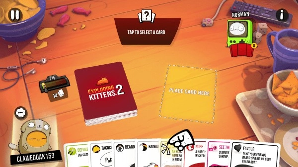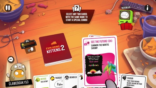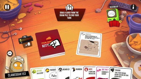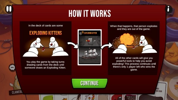《爆炸猫2》是一款适合2至4人游玩的卡牌对战游戏,玩法十分简单。简单来讲,玩家只需轮流从牌堆抽牌,牌堆里暗藏着搞破坏的“爆炸猫”。一旦抽到“爆炸猫”,或者没能成功阻止“猫咪牌”爆炸,玩家就会马上出局,最后成功留存下来的玩家即为获胜者。