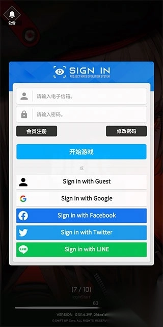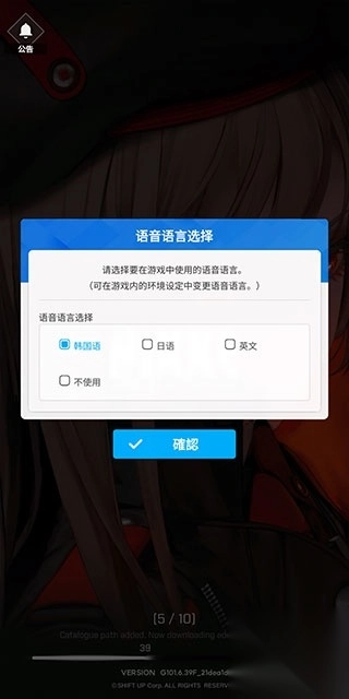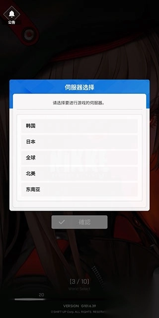 1、下载并安装《NIKKE胜利女神》后,第一步要选择国家地区(服务器选择在后续步骤),勾选全部同意的选项,然后点击下方的确认按钮。