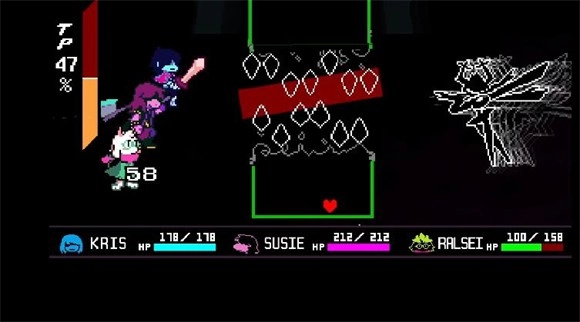 4、转阶段时 Boss会释放一个明显不同的红色斩击回合,活过这回合后不用管自己的状态条,直接使用复活粉随后下一回合只要你按照正常流程来打而并不会拖太久,boss就会进入一个蓄力回合,在这个回合内Kris勇气Susie防御Raslsei使用旋转蛋糕,之后便全员满状态进入了尾杀回合。