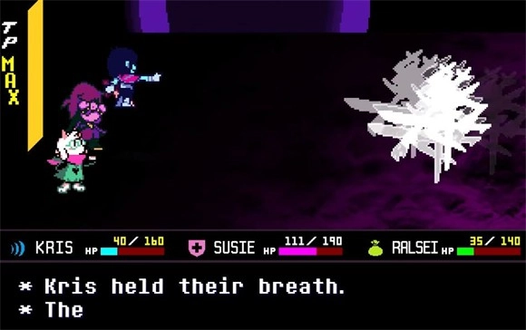 3、游戏开局,Kris紧紧逼向宝石,Susie则以粗暴的方式施展碎击,Ralsei选择防御。在这之后,Kris和Ralsei每回合都维持防御状态,Susie始终进行碎击攻击。要是Susie的生命值处于不健康状态,那么优先安排Ralsei为其使用回复药剂,而Kris依旧保持防御。