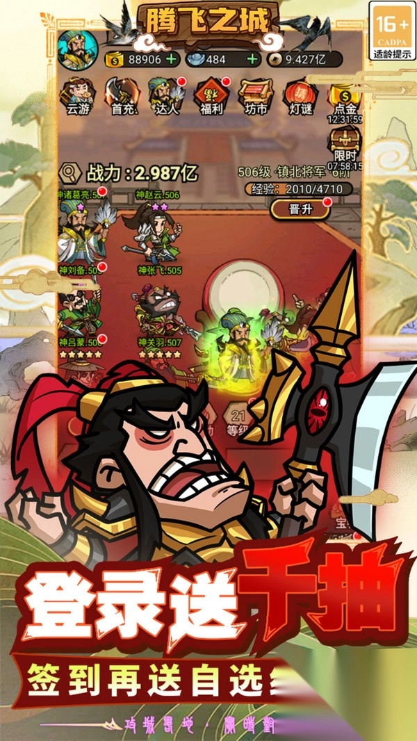 1玩家能够借助招募、活动以及副本挑战等途径来获得武将卡牌,还能通过升级、进阶与装备强化等手段提高武将的战力。