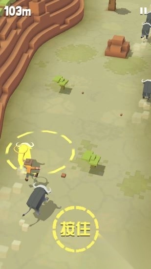 2、在遇到新动物后,先骑着当前的动物跑到新动物身后,接着松开手指,然后落在新动物的背上,再按住屏幕不要松开,然后拖动手指移动来躲避前方的障碍物,当屏幕中的【红心】进度条变满之后,就可以成功获取这个新动物了。