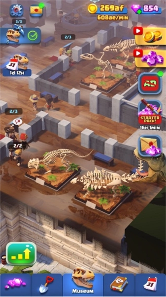 1、玩家探索不同地点,挖掘恐龙化石,收集资源丰富博物馆藏品,解锁新恐龙种类。