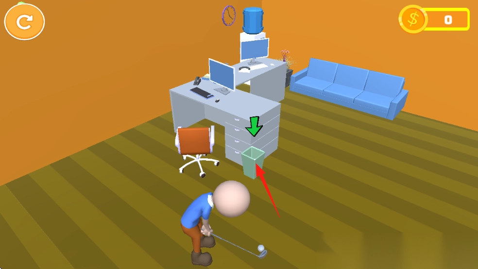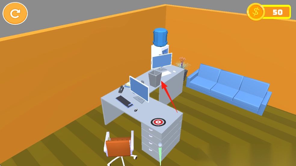 2. 操作机制:通过调整击球的角度与力度,使球避开诸如椅子、电脑之类的障碍,顺利落入绿色垃圾桶或桌上筐等目标区域。若操作成功,金币($)数量将从0增加至50 。