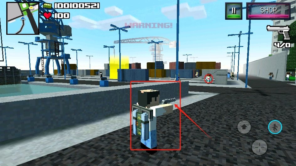3、继续用摇杆移动,注意右上角子弹4/20,钱够100可以去商店。