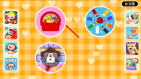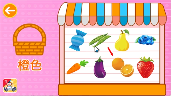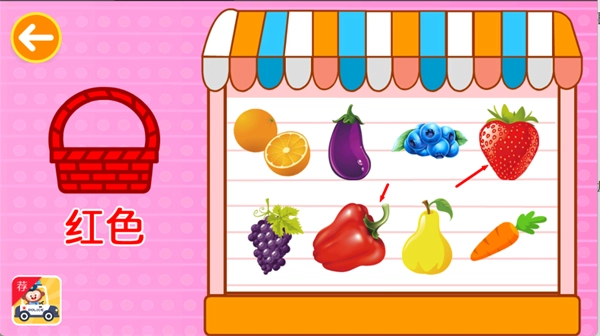 2、把画面里所有显示为红色的水果,拖移并放置到红色篮子内,完成对应颜色的分类动作。