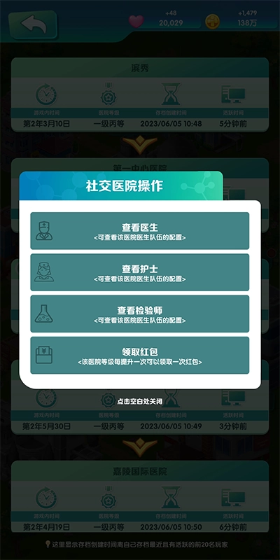 小技巧:此阶段可以去社交里面领取其它医院的升级红包,可以领几百万!!!你还说前期缺钱花吗??