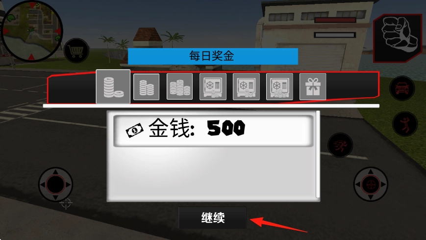 2、领取“每日奖金”,点击“继续”,获取初始资金,用于购买武器道具,提升战力。