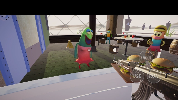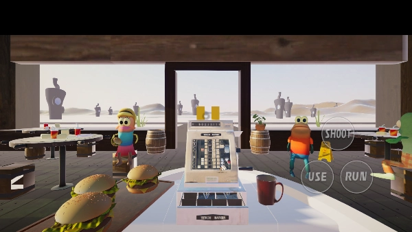 2、开启游戏,章鱼哥来到汉堡店上班,此时能看到三个操作按钮。当把目标点对准某样物品后,点击“use”就能将其拿起,点击“run”则可加速奔跑。