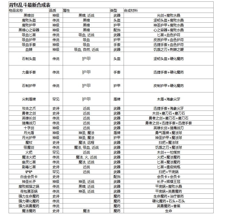 背包乱斗合成表大全