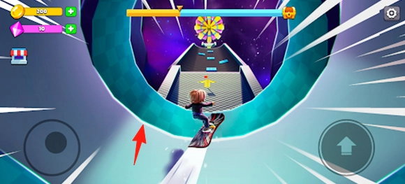 1、在太空隧道赛道,操控滑板角色沿【箭头】方向,保持平衡穿过隧道,冲向终点。