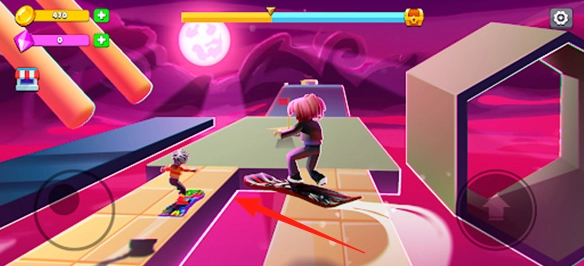 2、到粉色夜景赛道,让角色顺着【箭头】指引,避开障碍,超越前方滑板对手。