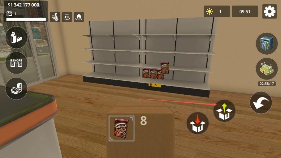 3、点击屏幕右侧带有箱子标志且形如↑的按钮,把商品从箱子中取出并摆放到货架上。