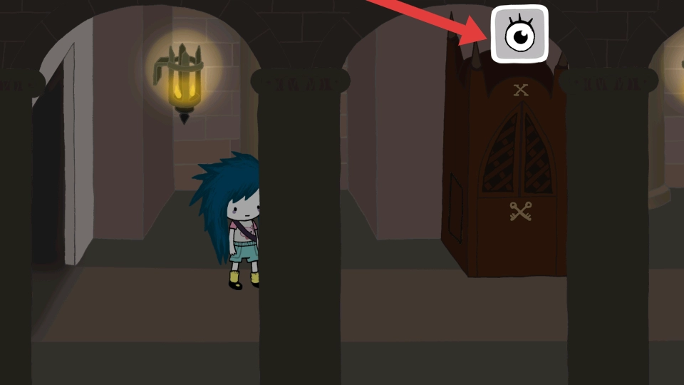 4、踏入昏暗的拱廊,留意墙上的灯具以及带有钥匙图案的柜子,在之前收集的道具里找出对应的钥匙来打开柜子,然后点击眼睛进行查看。