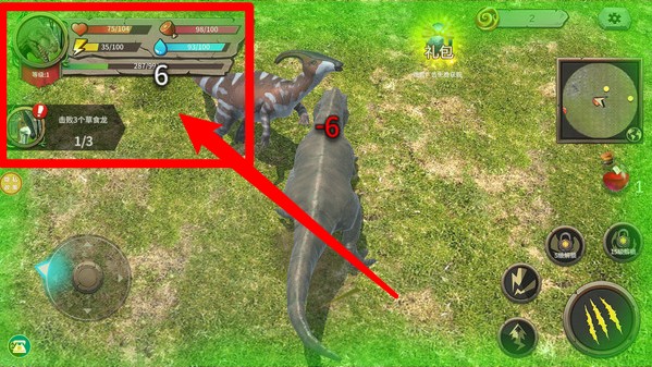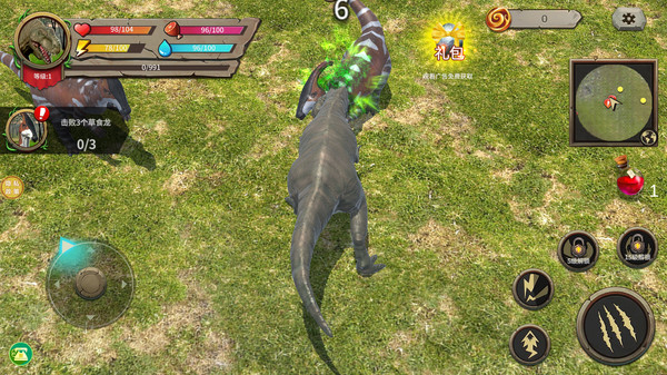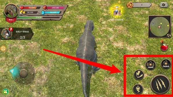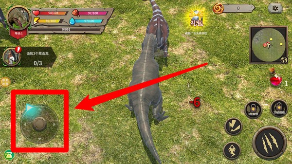 1. 左侧虚拟摇杆:在屏幕左下角拖动虚拟摇杆,以此操控暴龙移动,进而在草地中自由探索,寻觅猎物所在位置。