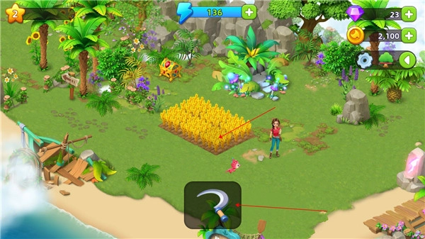1、轻点镰刀并拖动到农作物上方,即可完成收获!