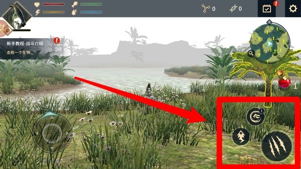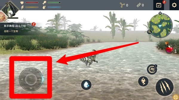 1通过操作左下角的虚拟摇杆来控制恐龙移动,在地图里对环境展开探索,寻觅食物或敌人,以此满足基本生存需求并维持良好状态。