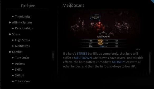 当一个英雄的压力条达到满值时,该英雄会经历一次理智熔解。此次理智熔解会引发一系列不良后果,比如英雄现有的全部好感度会丧失殆尽,同时生命值也会急剧下降至较低水平。