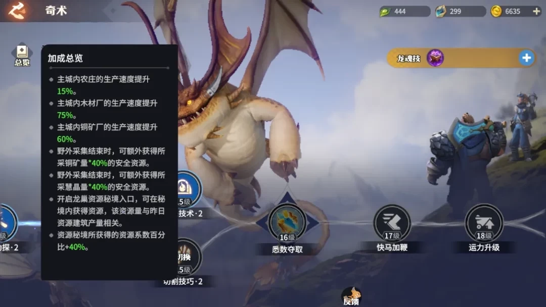相较于其他提升战力的功能,龙巢副属功能里的奇术常常被人忽略。它和其他功能存在差异,其带来的增益主要体现在资源获取量以及大地图作战能力方面,像资源生产加速、野外采集加速、对黑翼军团的伤害加成,还有运兵龙可携带的军饷上限提升等。