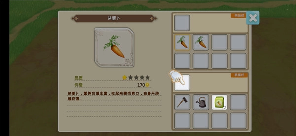 这里有个小细节,第一天不用开垦农田,等到第二天,卖胡萝卜所得的钱恰好能够用来升级工具,把洒水壶升一级,一次就能浇三块田,感觉超棒。