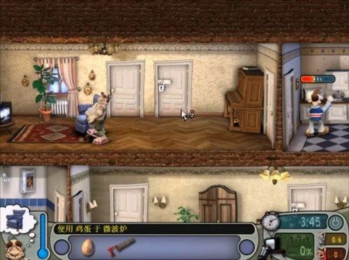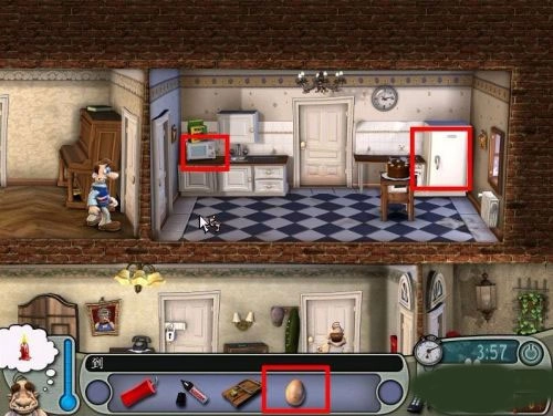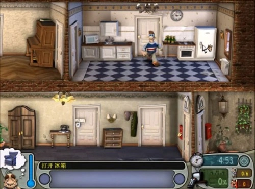 3、紧接着,从客厅的门走进二层厨房,好在此时boss已经下楼。赶紧到冰箱里取出鸡蛋,接着躲到左侧客厅的门后。时间把握得恰到好处,boss上楼来了。静静等着,等boss再次下楼,就马上把鸡蛋放进微波炉,随后又躲回到门的后面。