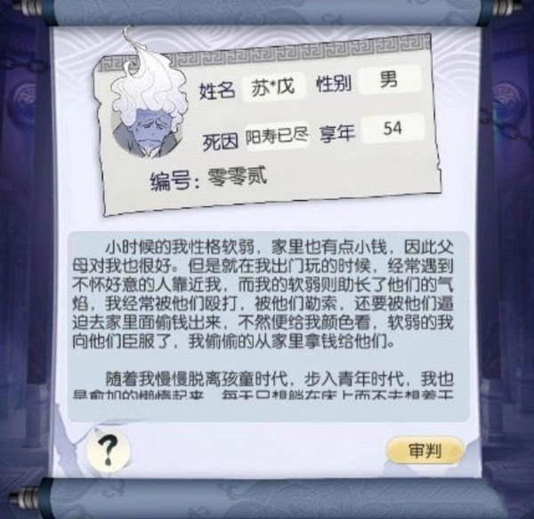 1在无极仙途中,小鬼的各项信息皆随机生成,无论是姓名、性别、死因,亦或是阳寿,这些因素都不会对最终的审判结果造成影响。小鬼的生平堪称判断其等级最为关键且直接的依据。生平至多由四段话语构成,每一段话都代表着待判鬼在不同时期的所作所为。依据每段生平所展现出的善恶程度,便能判定待判鬼的等级。