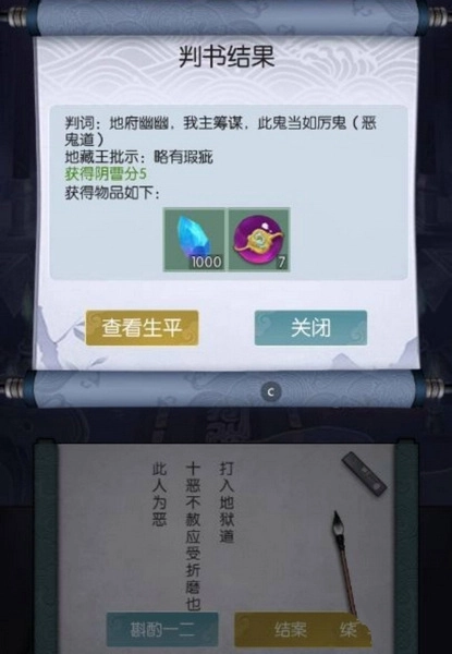 4、上方呈现的判书结果,是最终待判鬼的正确答案;下方所写,则是玩家给出的审判结果。无极仙途的道友们可将此结果与自身审判结论相互对照,从而总结出一套切实可行的评判标准。