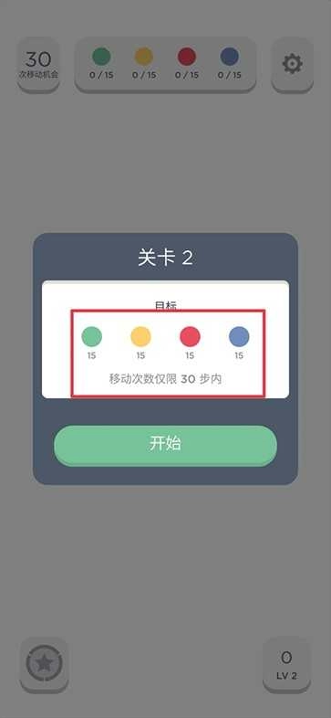 1、当进入关卡时,会呈现过关条件。比如,在下图里,规定要在30步之内完成特定数量的颜色点点消除方可通关。
