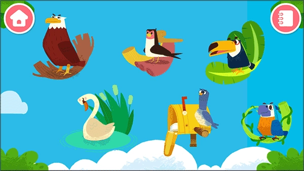 1、来猜猜小鸟们都栖息在何处?是池塘边,还是屋檐下,亦或是森林里……轻轻拨开树叶与草丛,仔细观察小鸟们的日常:捕鱼觅食、享用水果、在空中自在飞行。