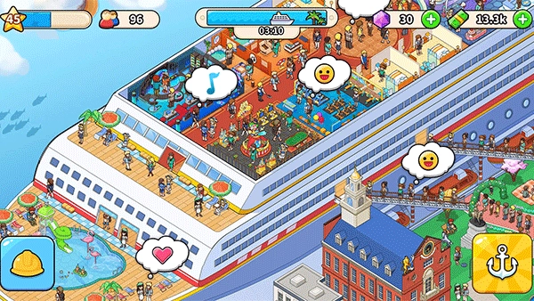 1、在游戏里,玩家要建造各类不同设施,乘客于游轮航行期间能够进行消费,如此玩家便能获取收入。